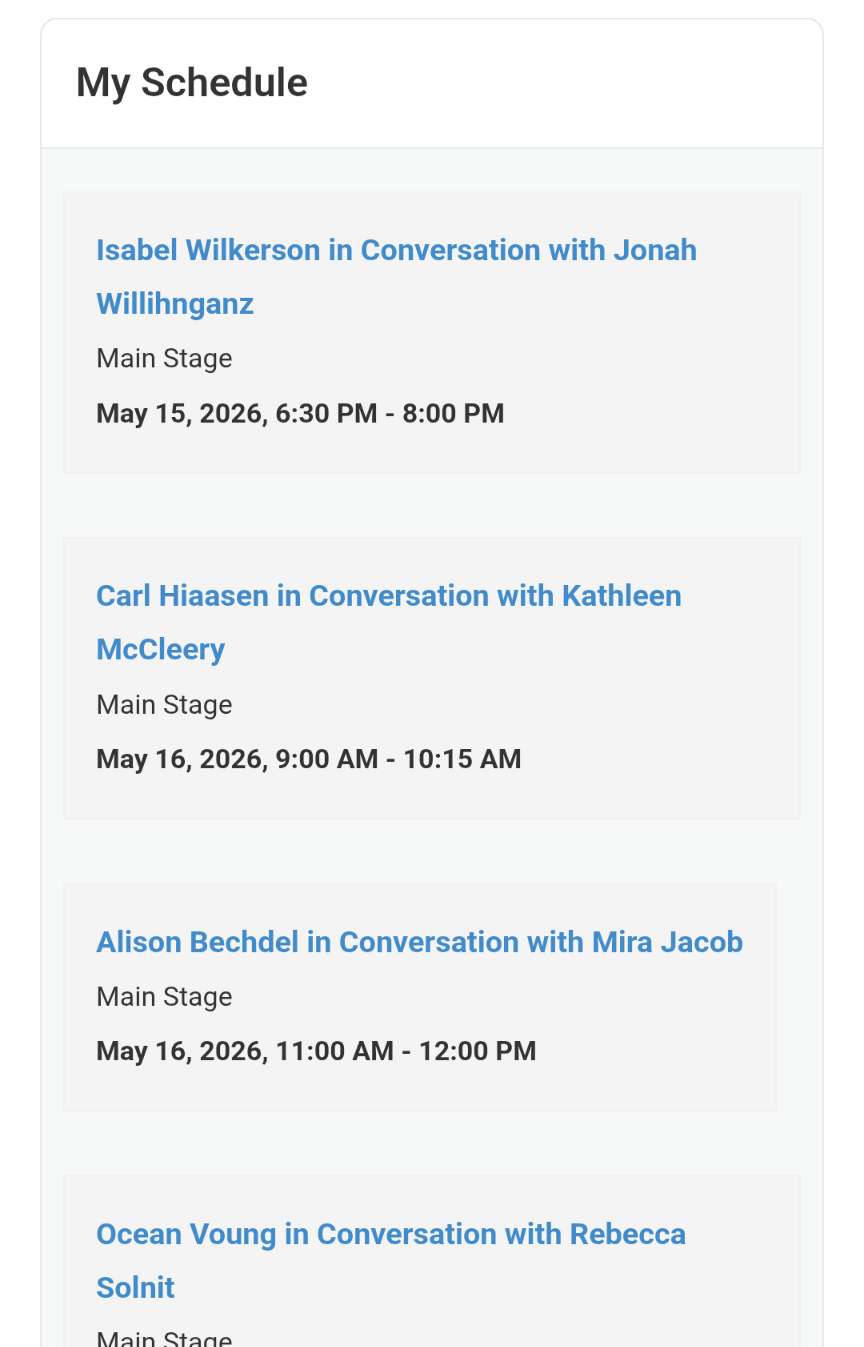 Main Stage authors are already registered to your Bundle Ticket. You can see those in the My Schedule section. Those authors cannot be canceled or removed from your ticket.